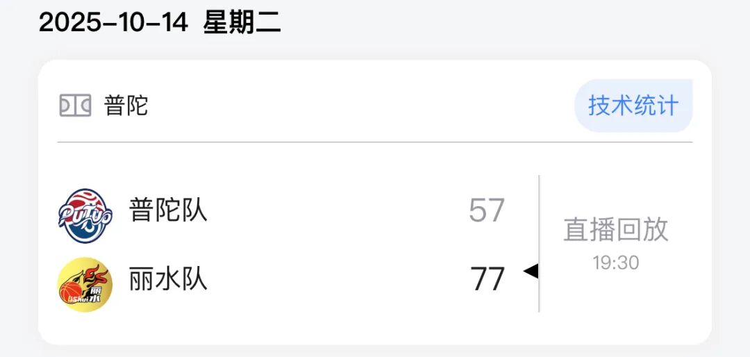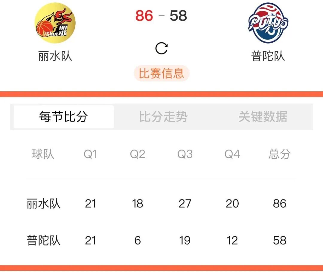 本场比赛后,丽水队的战绩为15胜4负积34分,普陀队的战绩为3胜16负积22分。