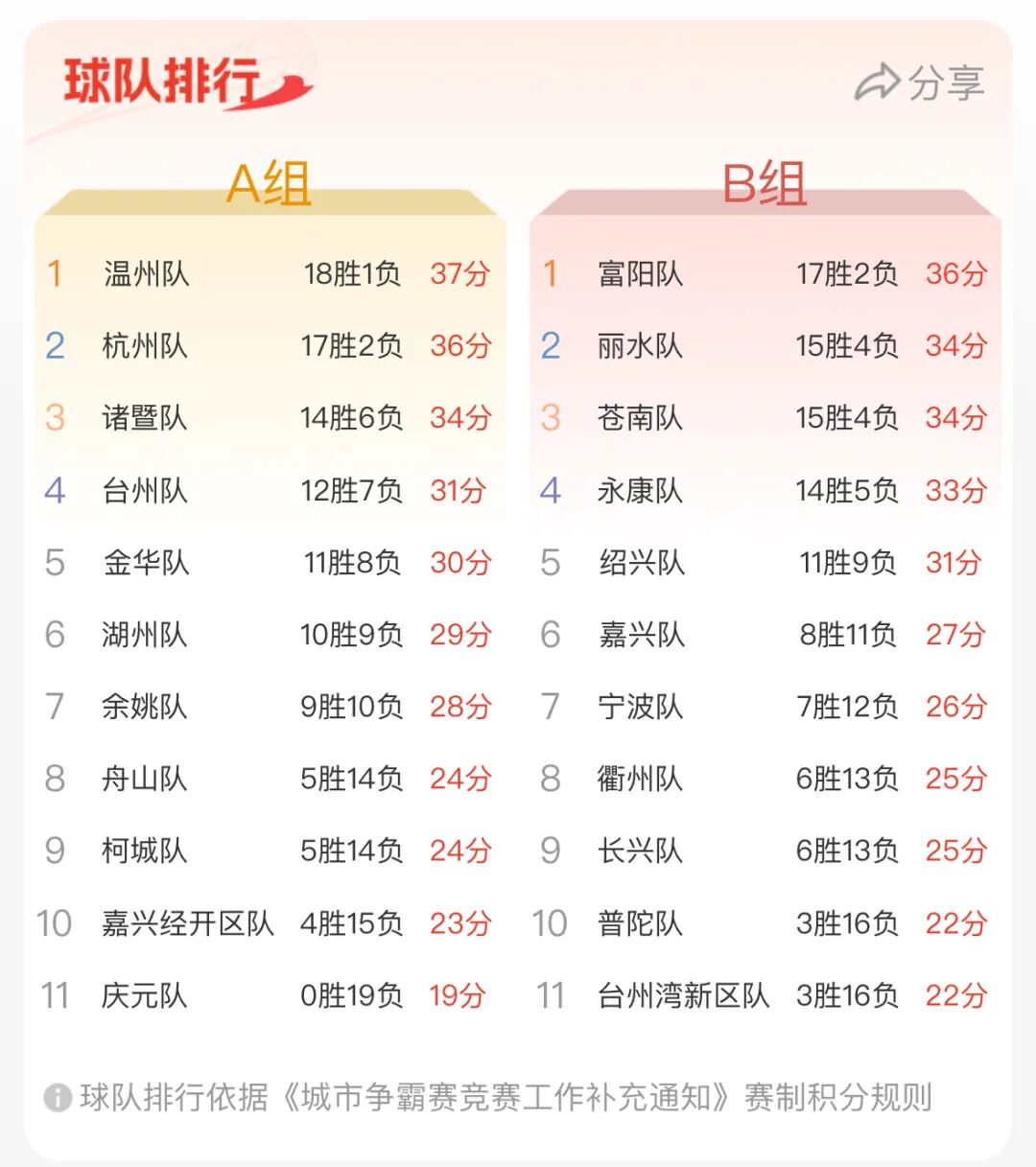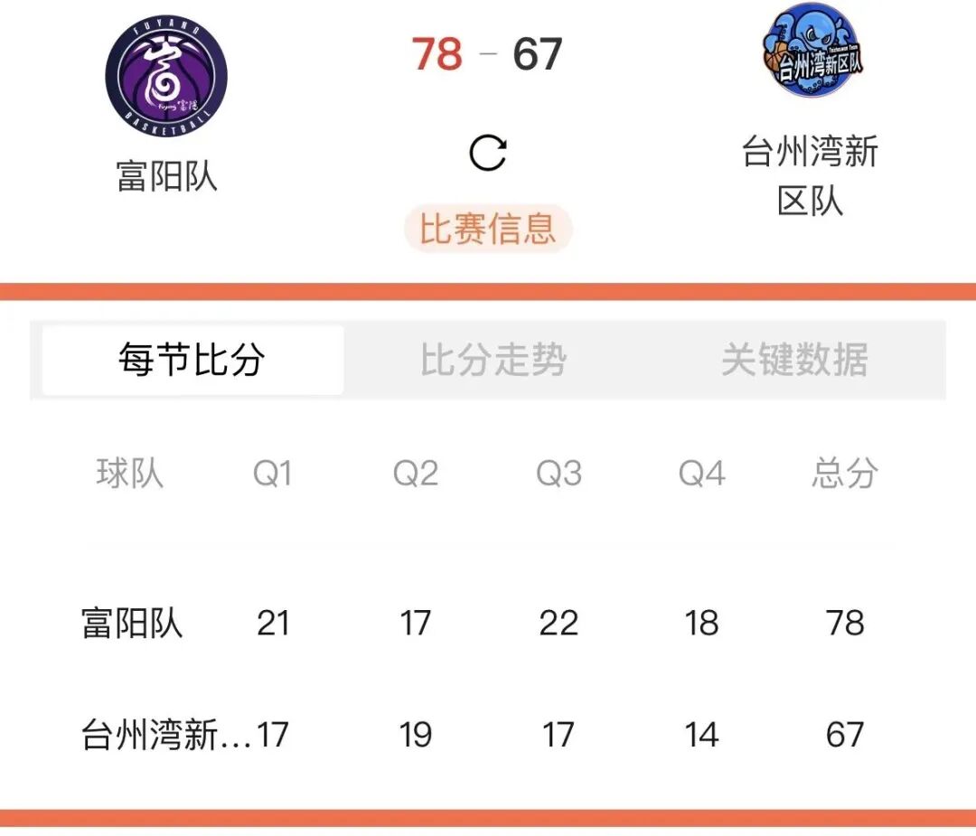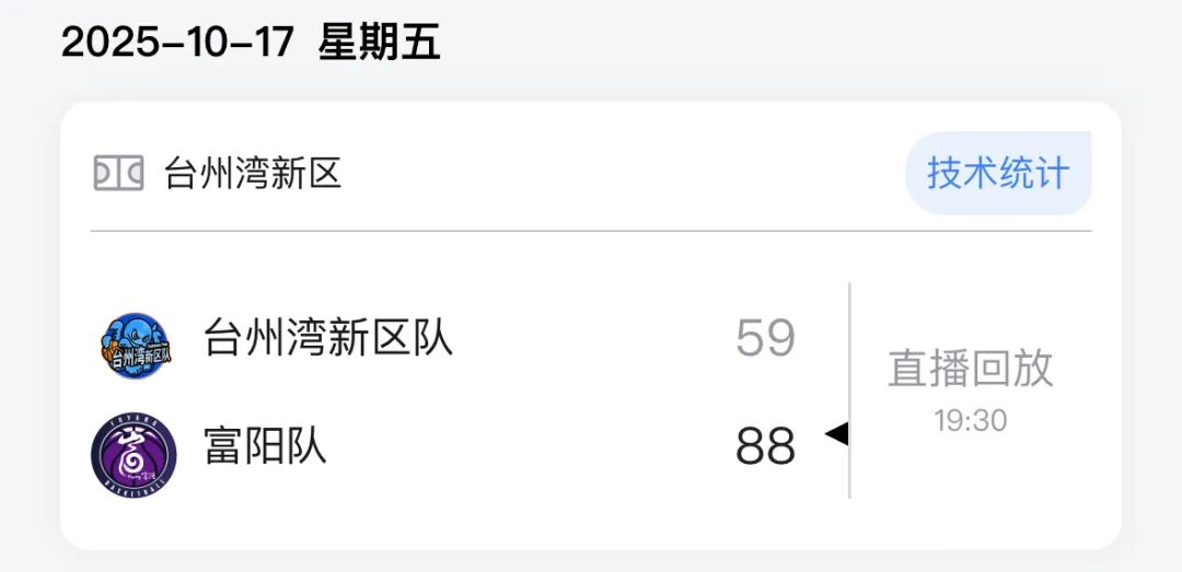 本场比赛后,富阳队的战绩为17胜2负积36分,台州湾新区队的战绩为3胜16负积22分。