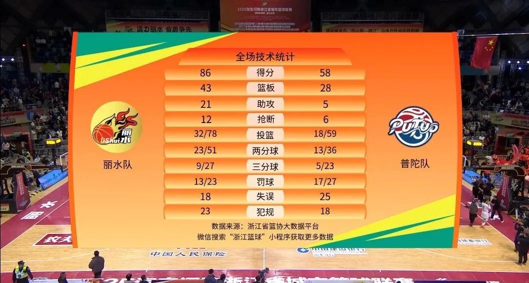 本场比赛后,丽水队的战绩为15胜4负积34分,普陀队的战绩为3胜16负积22分。