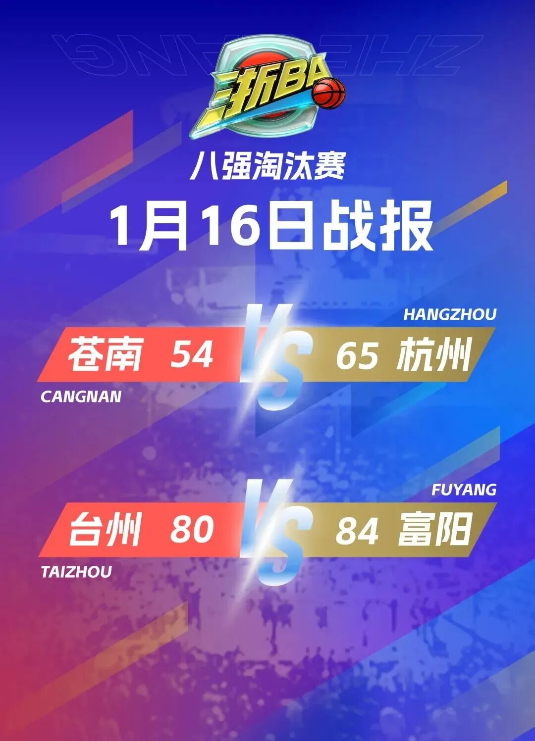 1月16日晚,“浙BA”八强淘汰赛画上圆满句号。富阳队客场战胜台州队,成为四强球队中唯一的区县球队。同时,杭州队客场击败苍南队,锁定半决赛席位。
