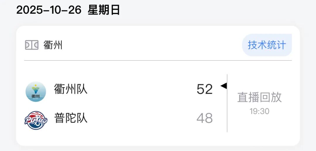 本场比赛后,普陀队的战绩为3胜17负积23分,衢州队的战绩为7胜13负积27分。