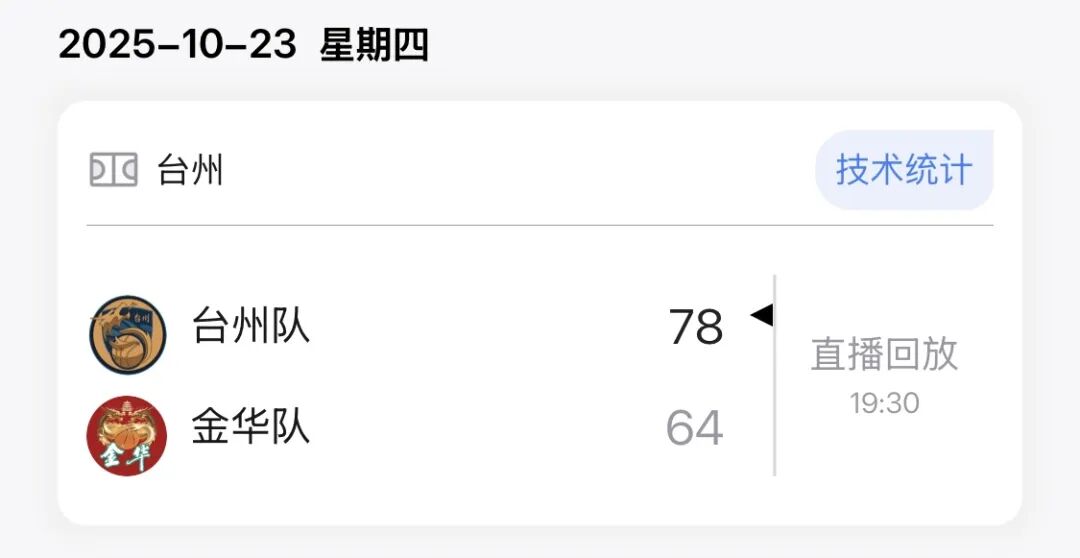 今晚赛前,台州队以12胜7负位列第四,金华队以11胜8负紧随其后。若台州队取胜,将以33分直接晋级;若金华队获胜,则两队积分将持平至32分,且交手结果为一胜一负。根据竞赛规则,同分情况下需比较相互交锋的净胜分。在首回合较量中,金华队曾以64∶78不敌台州队,分差为14分。这意味着,今晚金华队不仅要全力争胜,还必须至少赢下对手15分,才能凭借净胜分优势实现逆转,挺进八强。