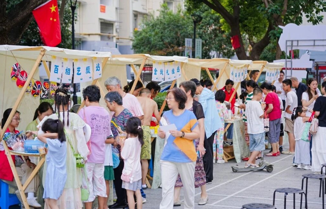 而在舞台的一侧,市集长廊的烟火气也悄然升腾,“小满茶咖站”飘出桂花拿铁的馥郁香气;“团圆炙味站”爆汁烤肠香气四溢;“百相艺颜站”前,居民们专注地在面具上绘制月兔图案;“金秋礼桂站”的干花香袋制作区排起长队。年轻爸爸夏先生表示:“孩子做的扭扭棒小月饼比买的更有意义。”本次市集中的每个摊位均设置“一元公益”捐赠箱,让节日与爱心同行。