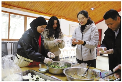 中外青年一起包饺子。