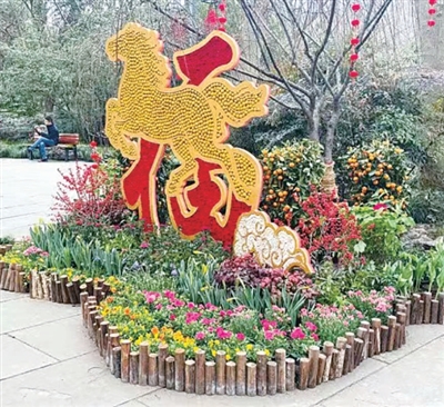 比如,飞来峰景区主通道旁的《香梅福满三重奏》,运用红梅、金橘等构成花境骨架,植物材料装饰的两匹骏马构架展现了马年主题。“春”字小品配合石竹、紫罗兰、郁金香、水仙等花卉,让游客进入景区就能感受到浓厚的新春气氛。