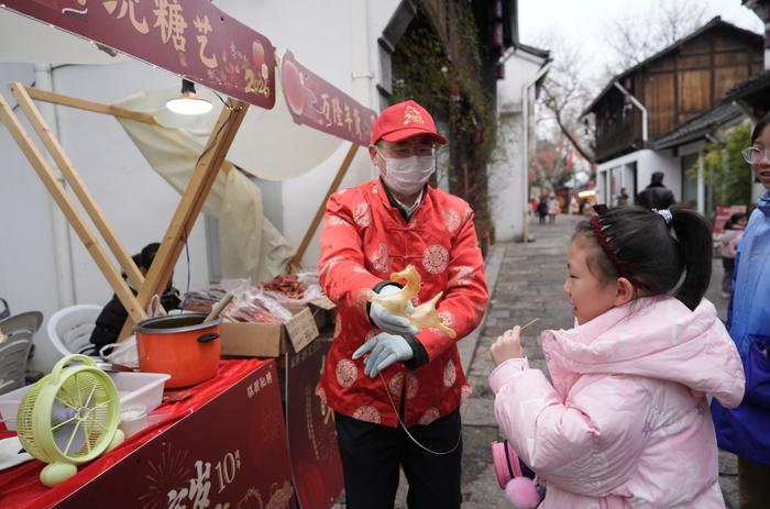活动形态亦随之丰盈。从最初书院内的围炉夜话,逐步拓展至桥西景区、运河广场、博物馆群,形成广阔的“运河书事圈”。备受喜爱的“书福送福”,再次以笔墨传递最诚挚的新春祝愿。今年新增的“非遗竹马”与“拱宸颂福”流动演出,为街区注入灵动韵律与艺术雅韵。热闹的“年俗集市”上架了年糕、年糖、年宵花,市民一边采购年货,一边感受浓厚年味。