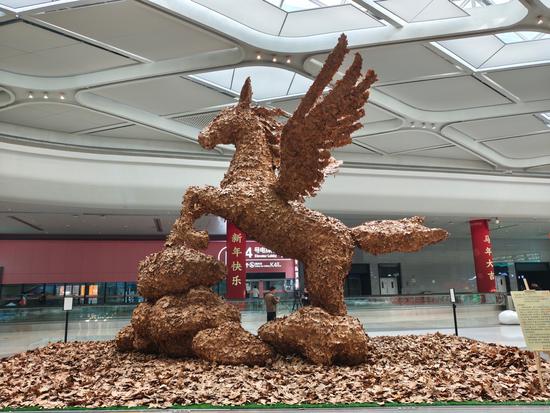 在交通中心,由梧桐叶搭成的“翼马·云归”新年装置吸引了不少旅客驻足打卡。振翼欲飞的骏马,藏着丙午马年的祥瑞祈愿。公益摄影点则为往来旅客免费拍摄“旅途中的新年照”,定格即刻的团圆与喜悦。不远处,“马上有福”新年快闪活动轮番上演着歌舞、话剧等精彩节目。