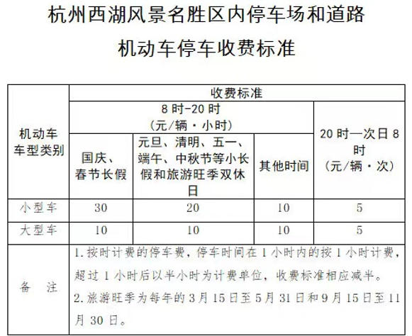 根据杭政办函〔2014〕101号文件规定,西湖风景名胜区政府定价停车场及道路泊位执行春节长假收费标准:
