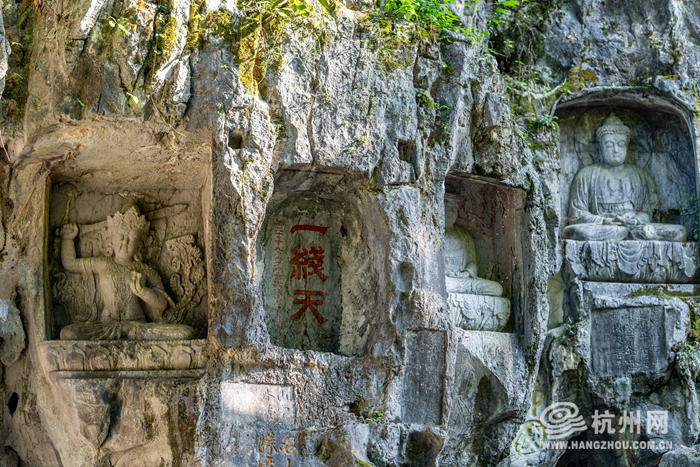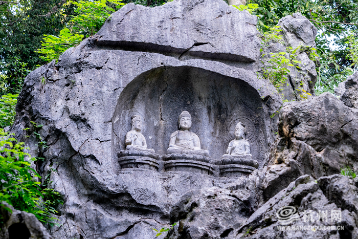 除了烟霞洞的造像,飞来峰的造像也是吴越时期的精品。飞来峰位于灵隐寺景区内,走出烟霞洞需继续沿着满觉陇路上坡,到龙井山顶后从北坡下,途经双峰路后,在梅灵北路往北转一直骑行,之后就能看到灵隐寺景区的大门。