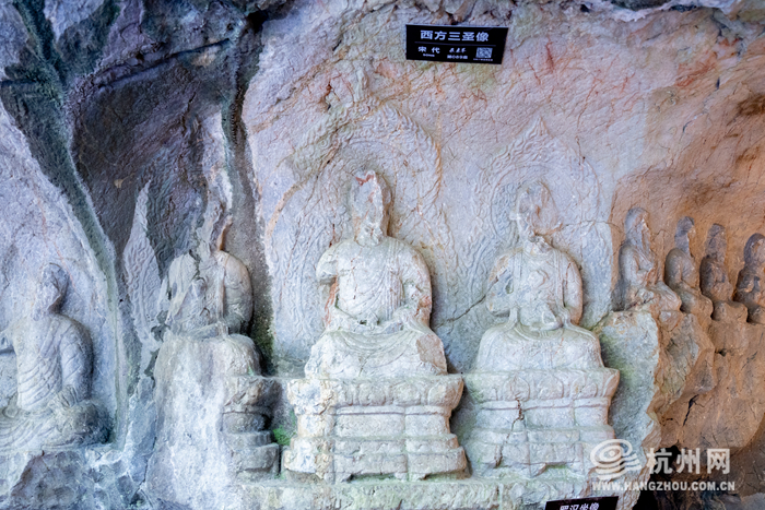 目前所见飞来峰有题记的造像中,年代最早的一龛位于青林洞内,是五代后周广顺元年(951)滕绍宗所造“西方三圣像”。火焰背光尚有晚唐遗风,其莲台束腰呈瓜楞形,与吴越国的青瓷造型隐隐相合,开启了后世渐趋细腻纤美的装饰之风。