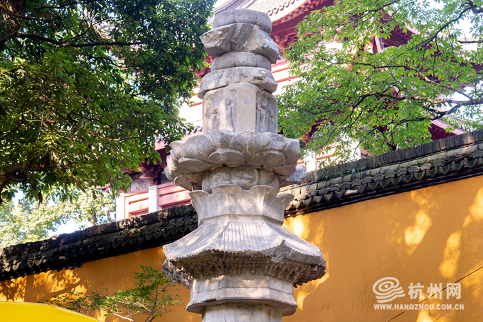 此外,灵隐寺还有两座吴越时期的陀罗尼石经幢,分别位于天王殿外东西两侧,原为吴越国王钱弘俶建造立于钱氏家庙奉先寺,后迁至灵隐寺,历经千年虽有残损,仍不失沧桑之美。灵隐寺石经幢造型优美,气韵灵秀,雕刻精致,为五代至北宋佛教经幢建造成熟时期的代表作之一,见证了灵隐寺悠久而辉煌的历史。