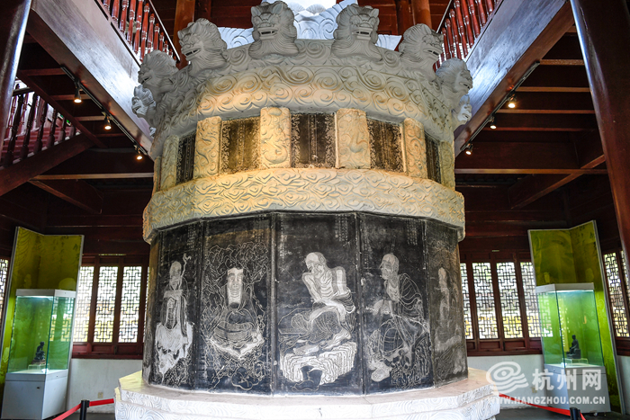 孔庙还藏有极具艺术价值的吴越时期文物,那便是晚唐五代高僧贯休所绘的十六罗汉像刻石。每尊罗汉像上还刻有乾隆皇帝根据梵典修改原画上的罗汉位次和名号,以及他为像作的题赞。这些罗汉像刻石原藏于孤山的圣因寺,后移至孔庙的文昌阁,至今仍完好无缺。《十六罗汉图》中的罗汉形象,与传统的佛教造像不同,贯休大胆创新,赋予了罗汉们以“胡貌梵相”的奇异特征,不仅是艺术史上的宝贵遗产,也是研究贯休艺术风格和佛教美术发展的重要实物资料。