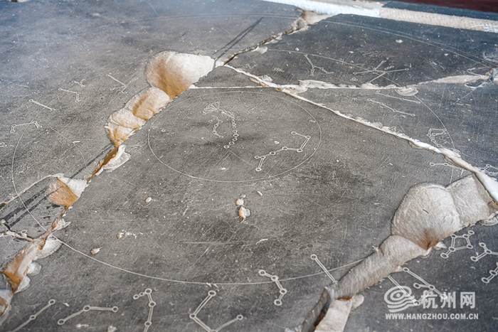 到了孔庙,不得不看的就是“镇馆之宝”——五代钱元瓘墓石刻星象图。这件文物出土于吴越国王钱元瓘之墓,被认为是目前世界上已知最早的石刻星象图之一,比苏州宋代石刻天文星象图早300多年、面积大4倍。全图星象以阴线刻画,刻工精细,位置准确,现存石刻星数183颗,星与星之间用双线连接,北极五星、北斗七星以及28星宿的位置非常准确,不仅为研究古天文学提供了珍贵的资料,也对了解古代吴越文化有着不可忽视的价值。