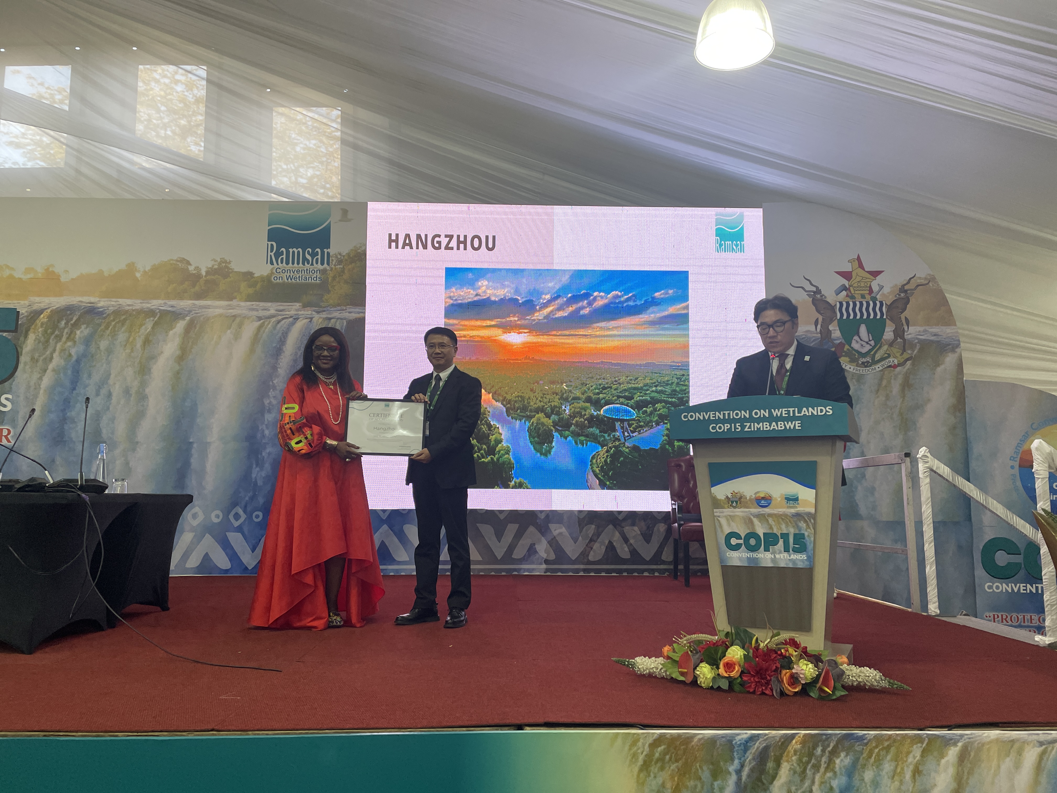 当地时间7月24日17:15,北京时间23:15,在津巴布韦召开的《湿地公约》第15届缔约方大会上,杭州市政府副秘书长程晓东从湿地公约秘书长穆桑达·蒙巴博士手中接过国际湿地城市认证奖牌。