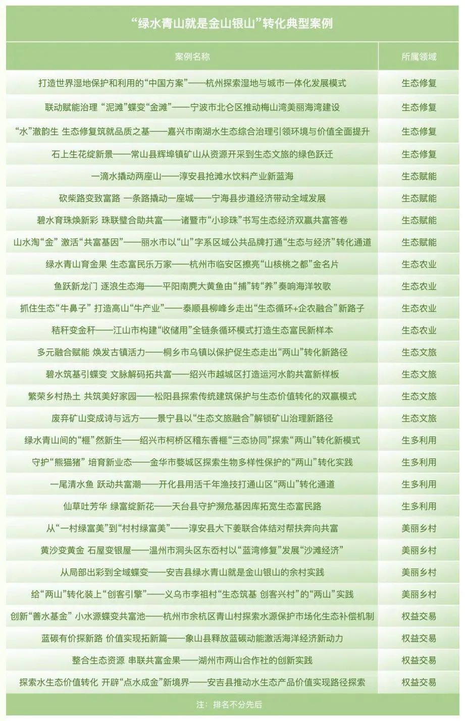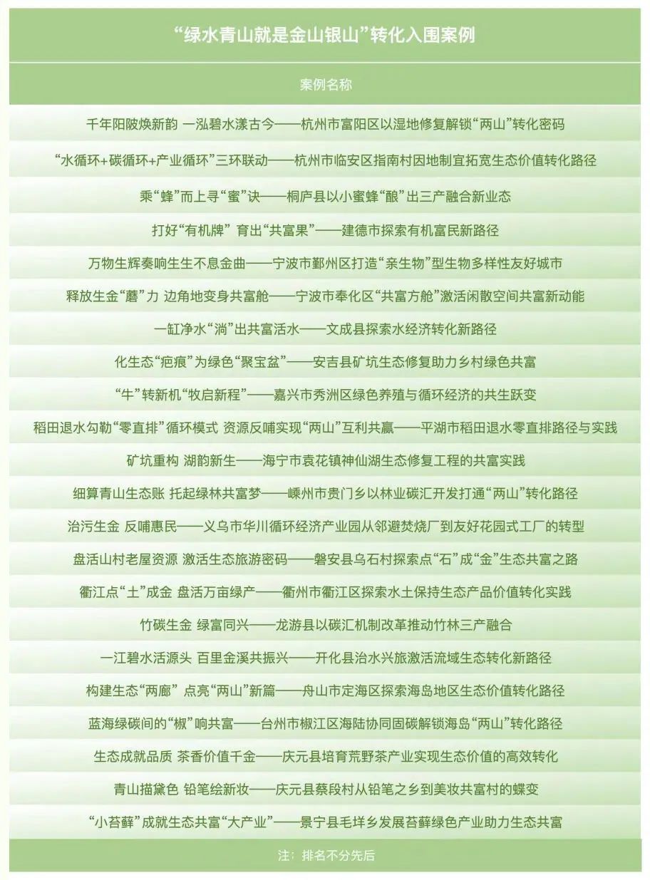 为深入学习贯彻习近平生态文明思想,总结提炼、交流传播绿水青山就是金山银山理念的生动实践和经验启示,省美丽浙江建设领导小组办公室组织开展了“绿水青山就是金山银山”转化典型案例征集评选活动,并于近日公布生态修复、生态赋能、生态农业、生态文旅、生多利用、美丽乡村、权益交易等7个领域28个典型案例及22个入围案例。一起来看都有哪些案例入选↓↓
