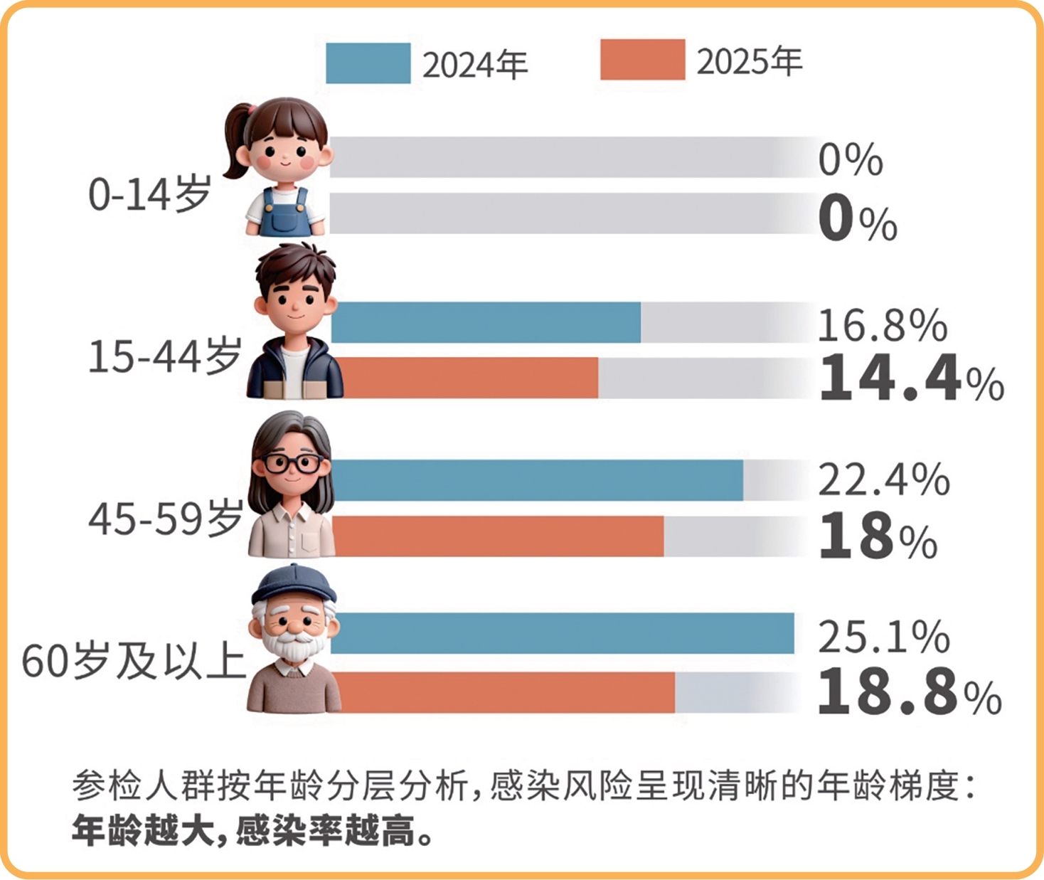 从数据来看,2024年、2025年,60岁及以上老年人群的阳性率在各年龄段中都是最高的,分别为25.1%和18.8%。