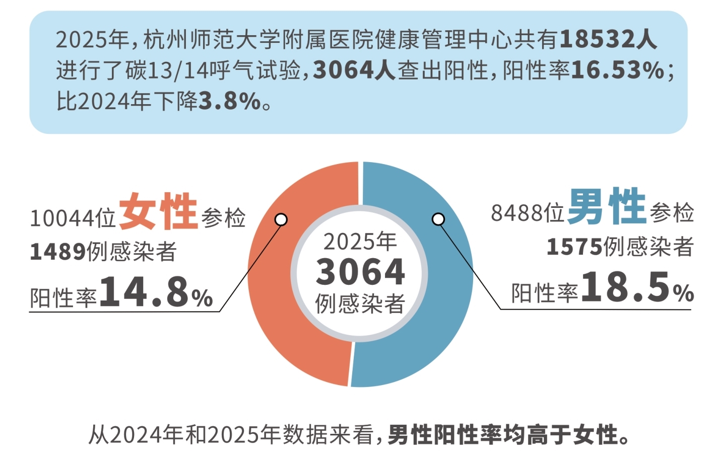 幽门螺杆菌筛查情况如何?我们请杭师大附院健康管理中心梳理了2024年和2025年两年数据:2024年,18467人做了碳13/14呼气试验,3763人查出阳性,阳性率20.38%。2025年,共18532人进行了碳13/14呼气试验,3064人查出阳性,阳性率16.53%。