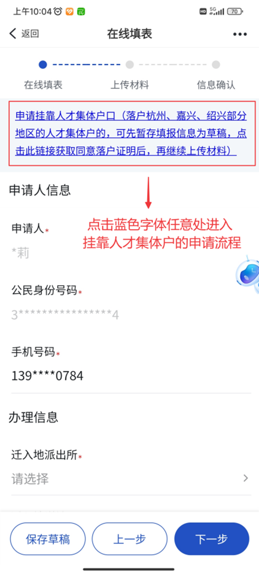 第三步:在线填表前点击蓝色字体进入挂靠人才集体户的申请流程,申请《同意落户证明》并下载文件后点击“返回”按钮至在线填表界面,其中迁入地派出所和迁入地详址按照《同意落户证明》上“集体户登记机关”和“集体户登记地址”填写;邮寄方式选择“窗口自取”。